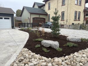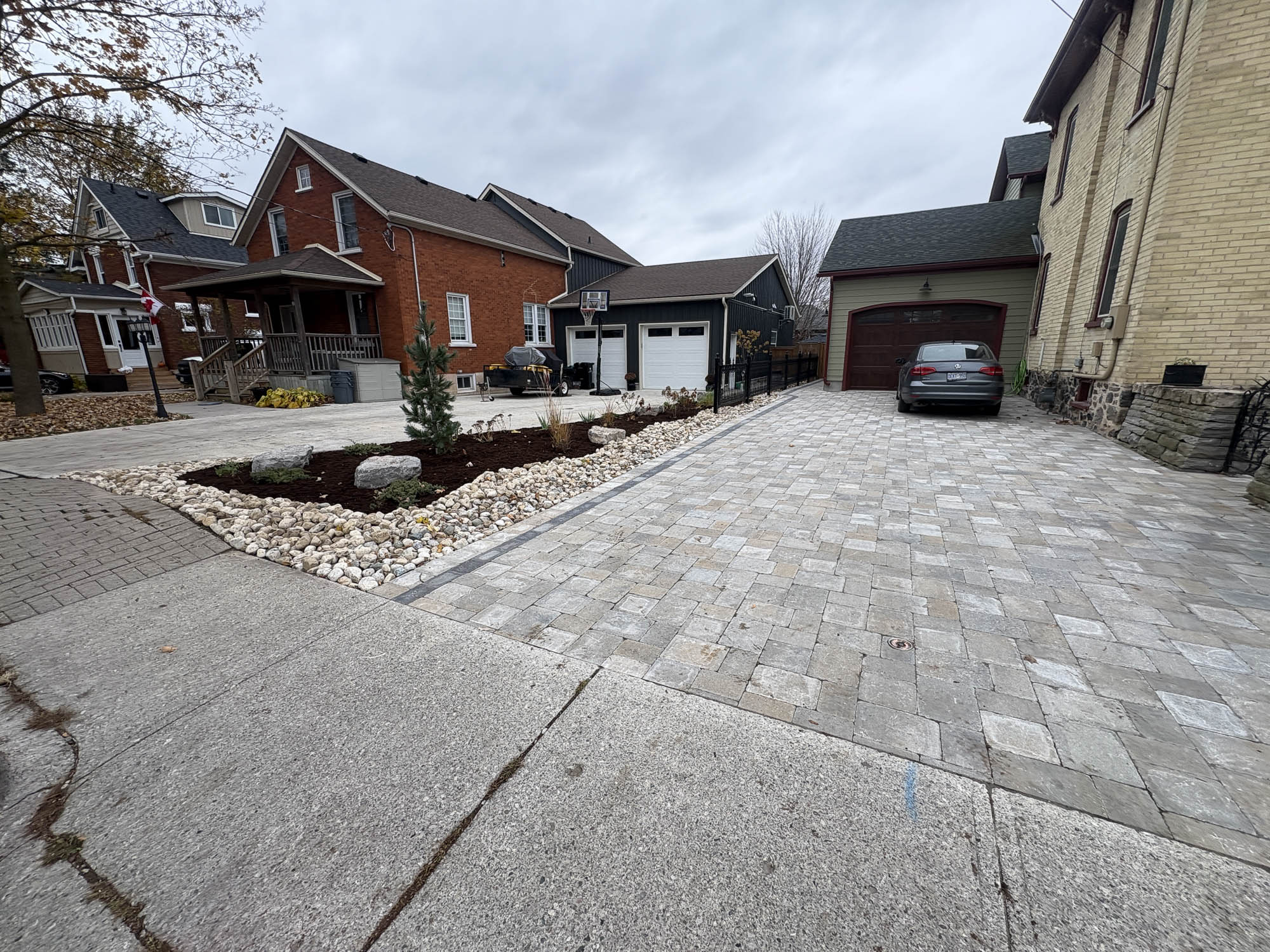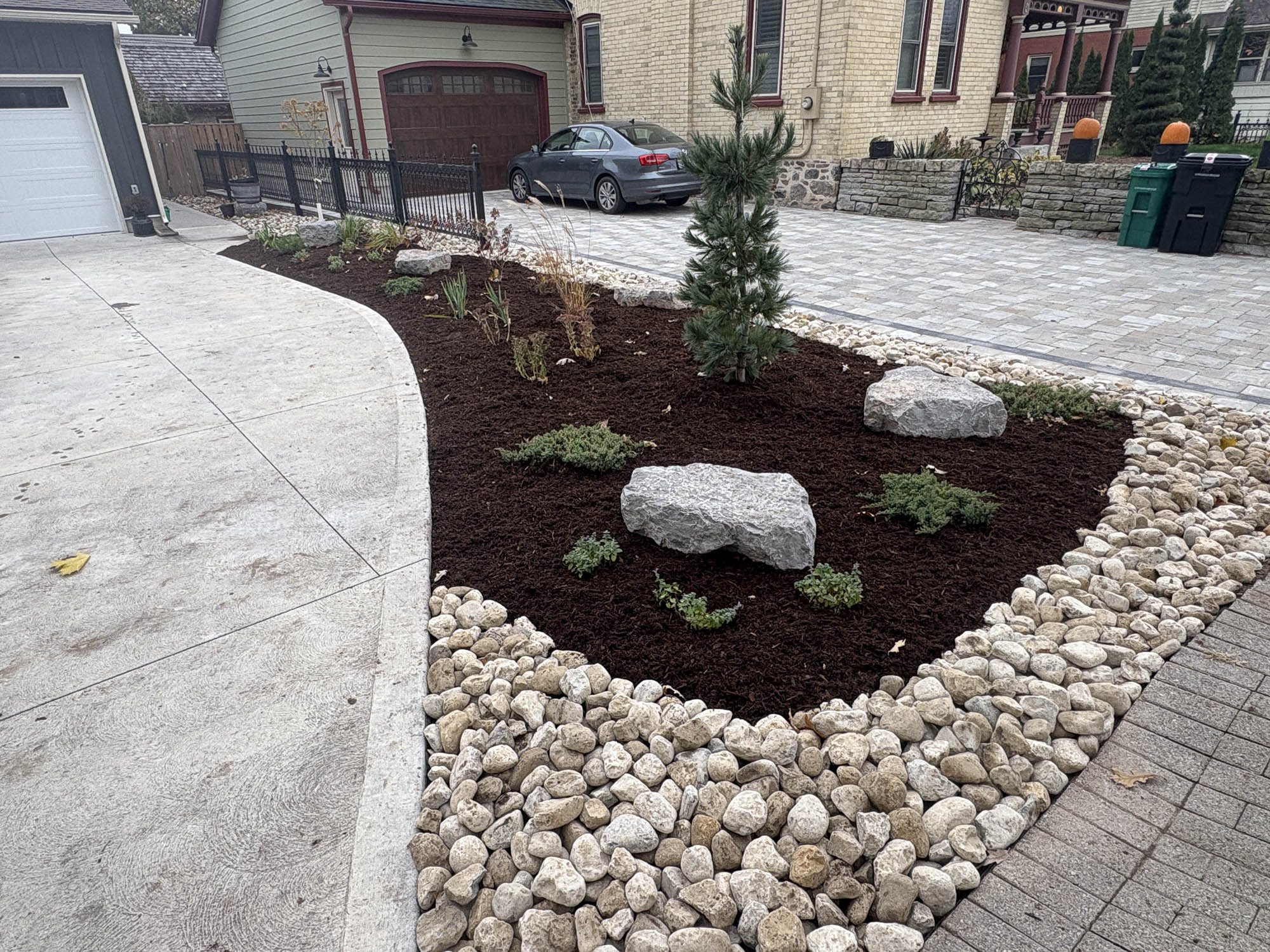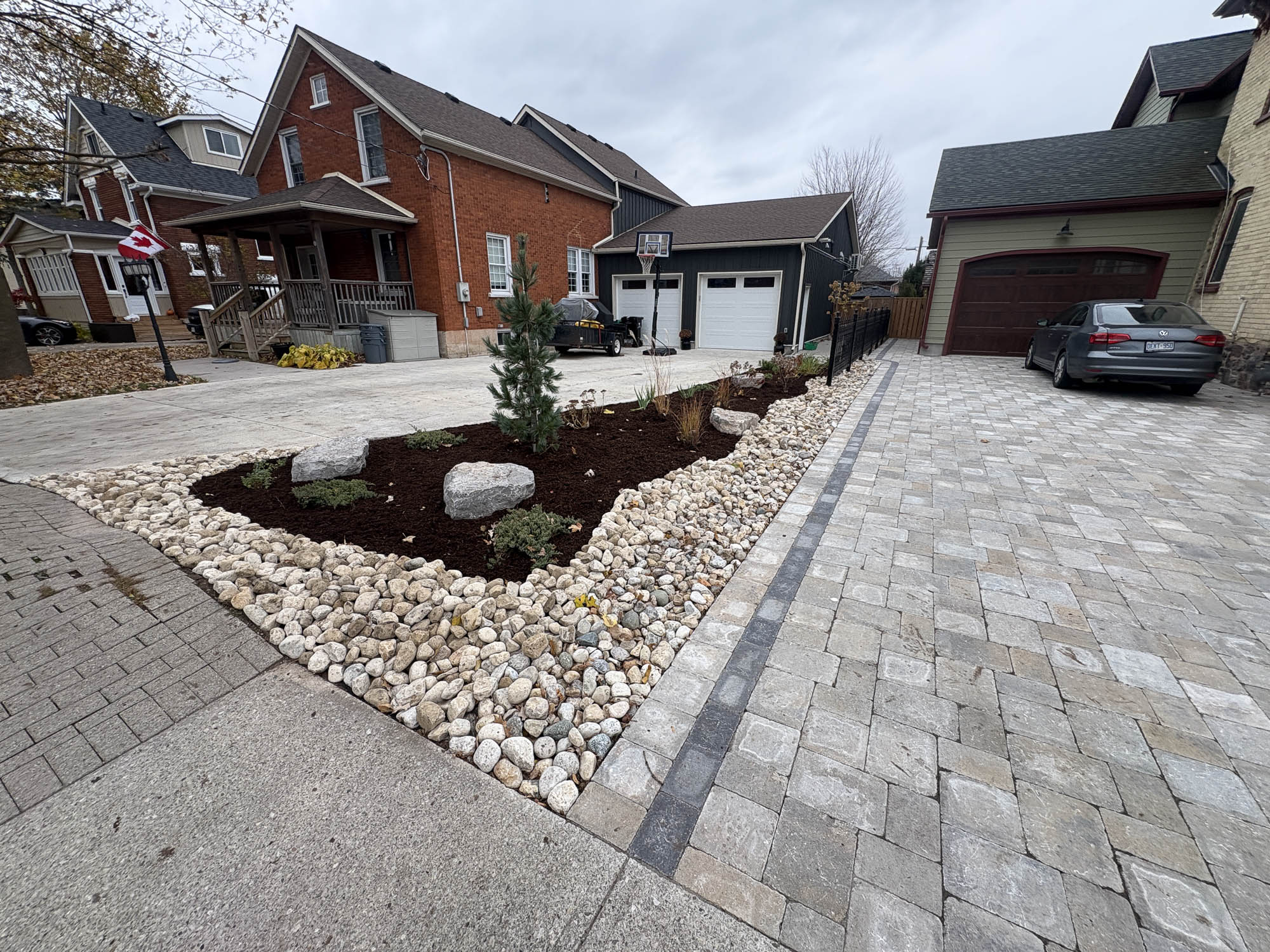 Where durability meets sophisticated charm. This project redefines the entryway with a precision-laid paved driveway, accented by a striking dark charcoal border. A curated island of river stone and dark mulch provides a low-maintenance, sculptural focal point that bridges the gap between classic architecture and modern landscaping.