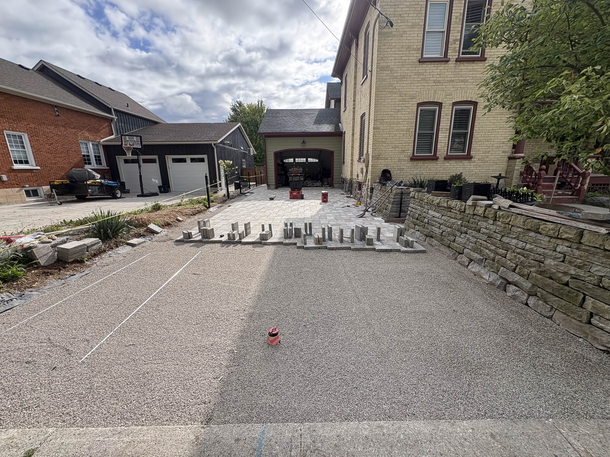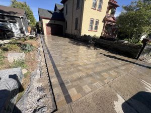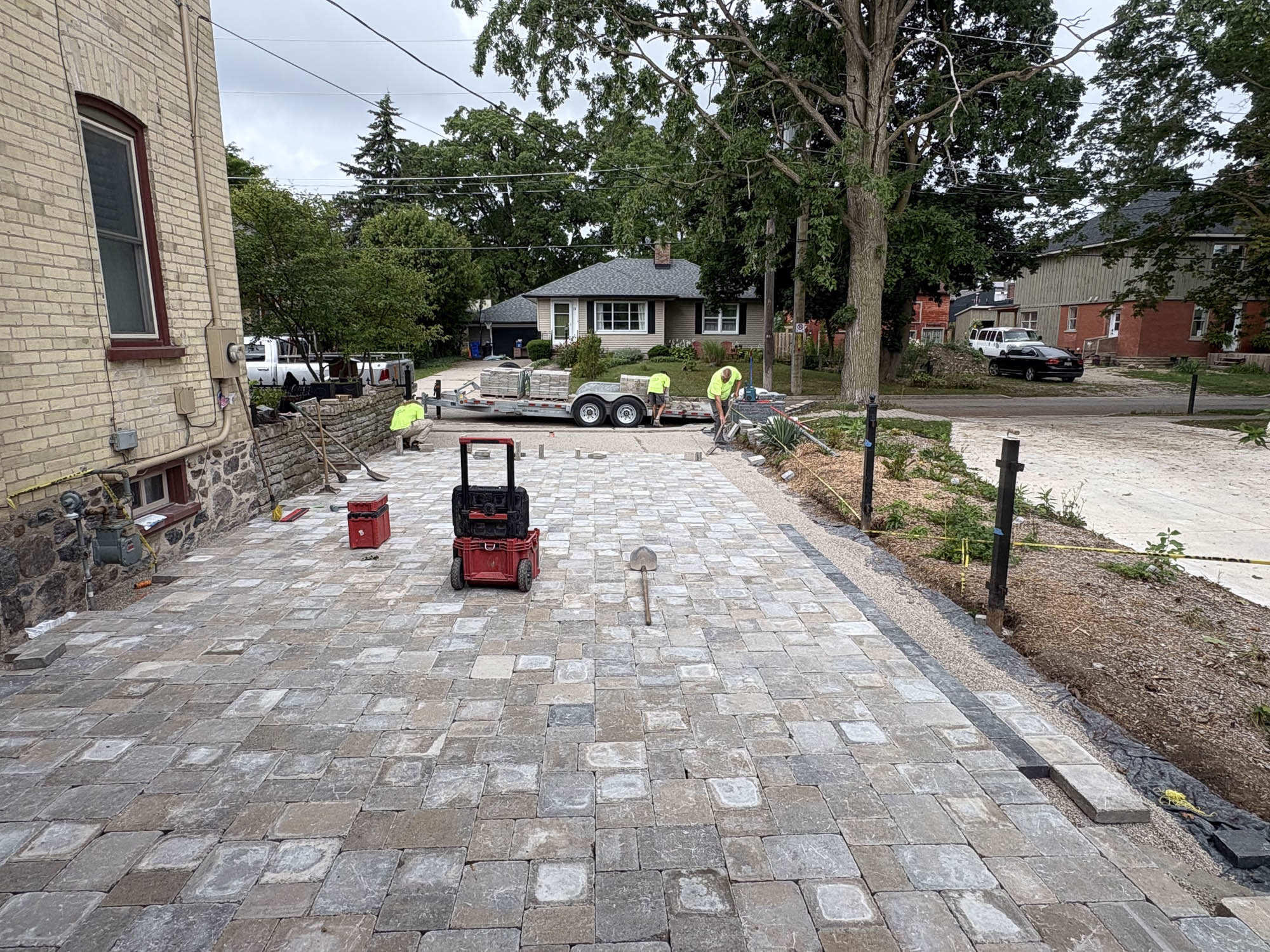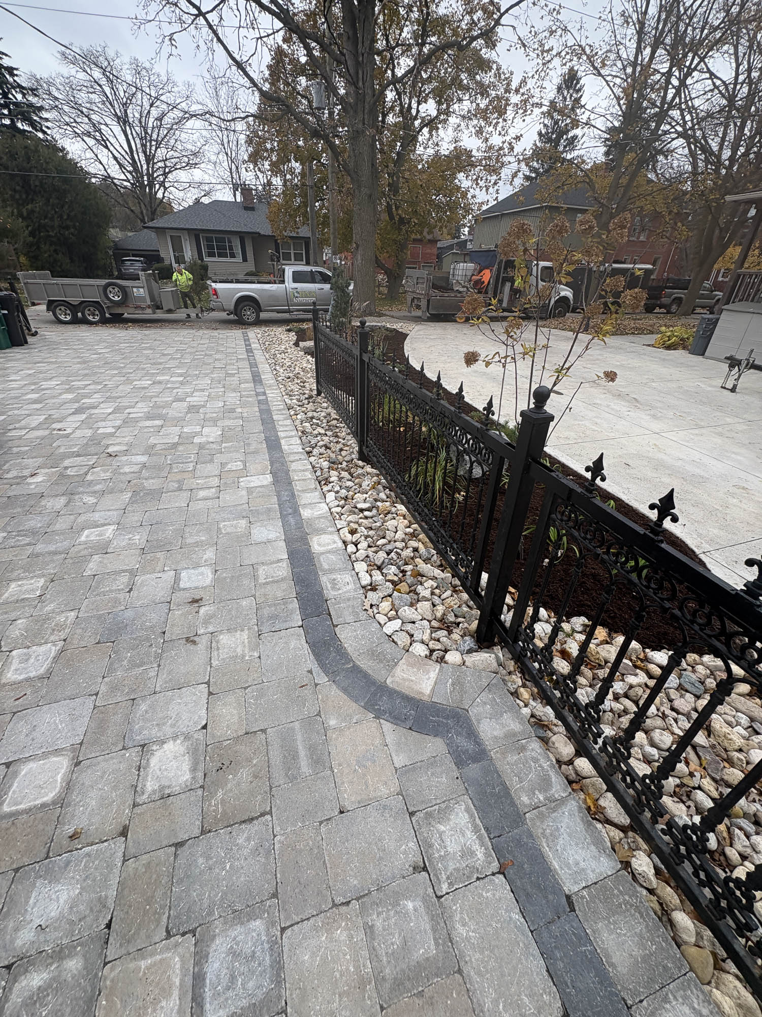 Where durability meets sophisticated charm. This project redefines the entryway with a precision-laid paved driveway, accented by a striking dark charcoal border. A curated island of river stone and dark mulch provides a low-maintenance, sculptural focal point that bridges the gap between classic architecture and modern landscaping.