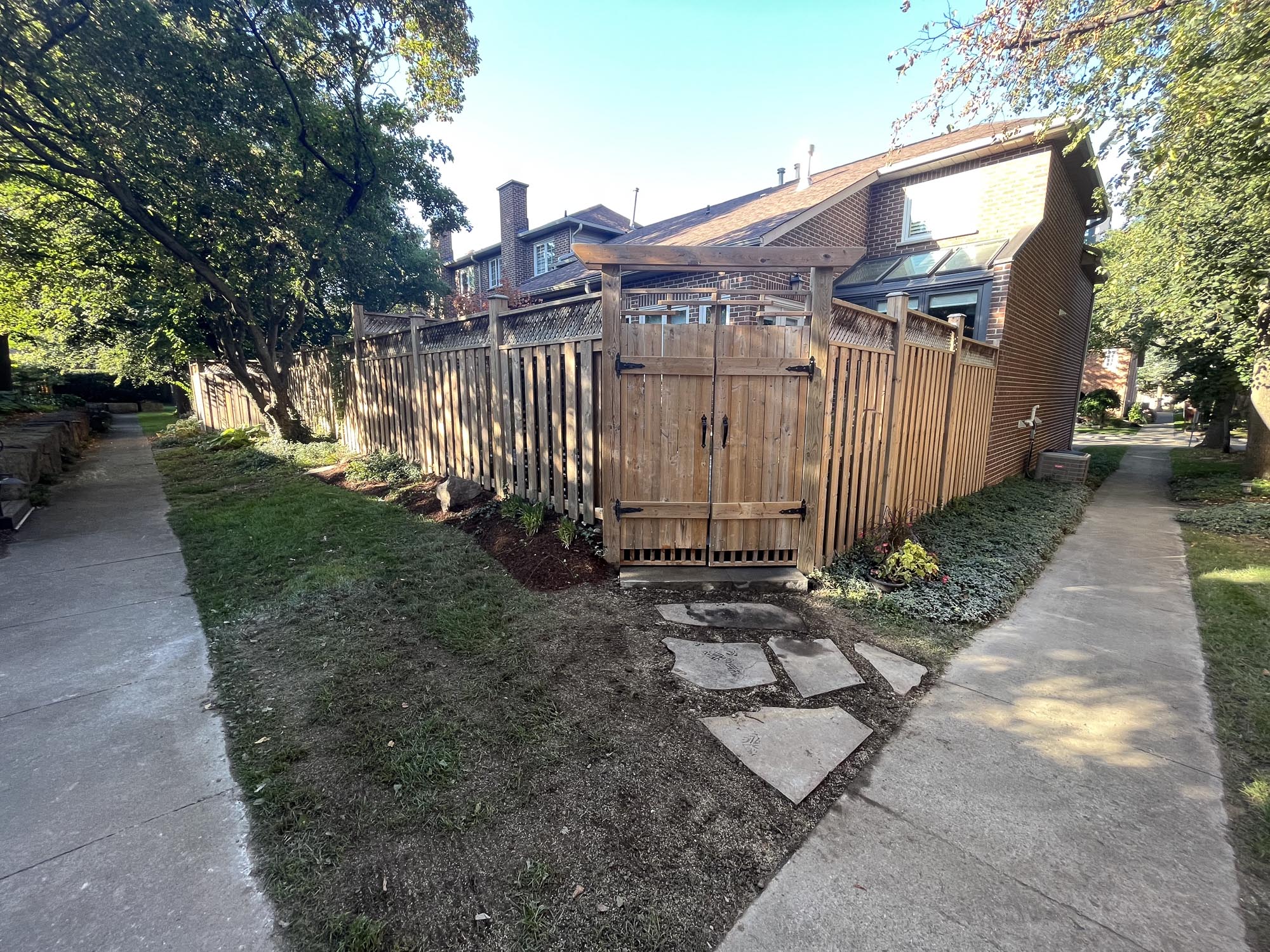 Soft greenery and layered plantings define the space, with ornamental grasses and a small tree adding depth and seasonal variation. Natural tones blend with surrounding elements, while filtered light from overhead trees creates shifting patterns. The result is a calm, enclosed atmosphere that feels balanced, quiet and peaceful.